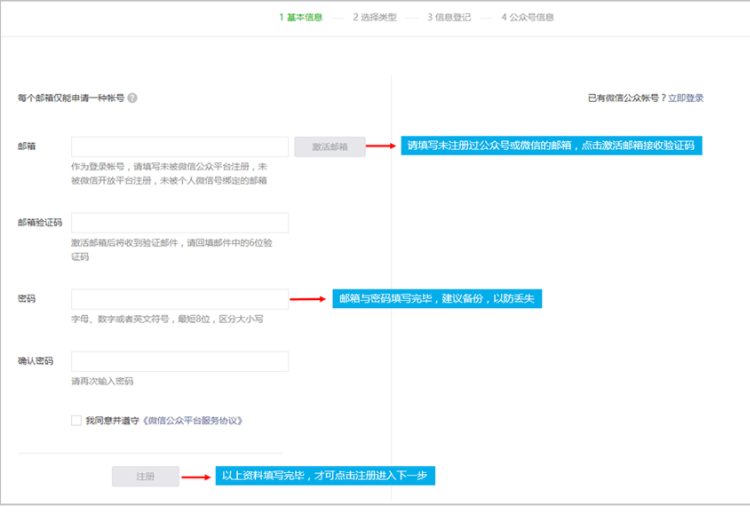 公眾號分:訂閱號、服務(wù)號、小程序三種帳號類型,注意注意1個(gè)郵箱只能注冊1個(gè)帳號。
