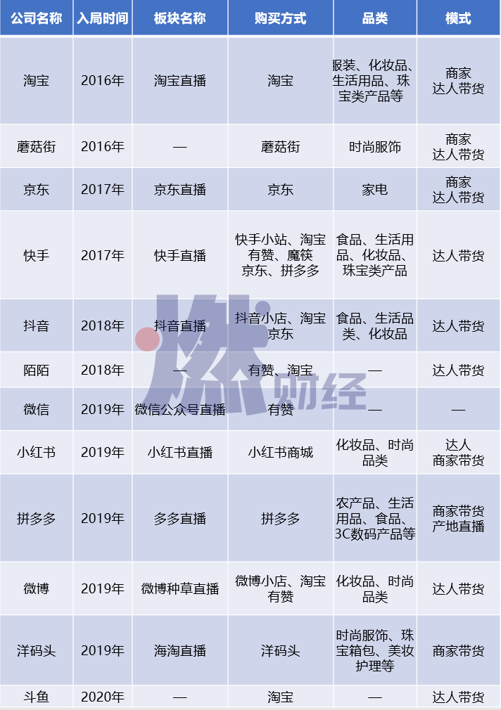 老牌玩家競爭激烈,新的玩家還在陸續(xù)涌入。燃財經根據公開信息,整理出一份入局直播電商的不完全名單。