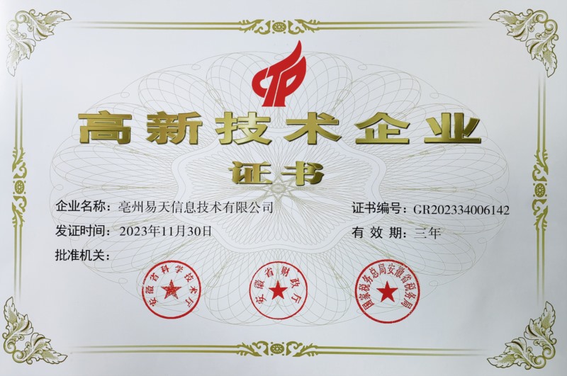 喜報 亳州易天科技榮獲《高新技術企業(yè)證書》